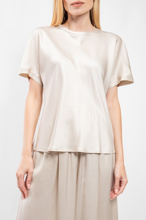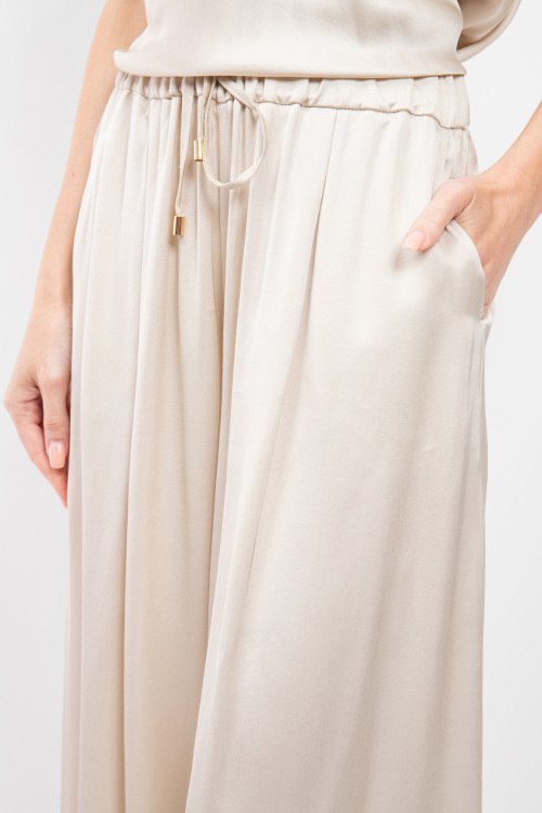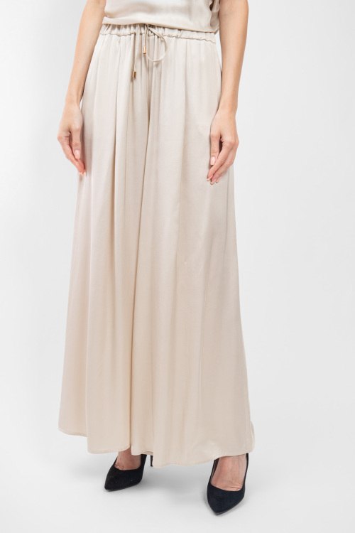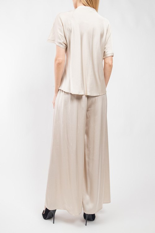 Женский бежевый костюм из вискозы с брюками-палаццо от Clothe (Клозе). Блуза: круглый вырез горловины, короткий рукав, классическая длина. Брюки: эластичный пояс на завязках, боковые карманы, широкий крой, полная длина. Размер вещи на фото: S. Блуза: длина: 59 см, ширина по груди: 59 см, ширина по талии 56 см, длина рукава: 8 см, ширина рукава 20 см. Брюки: длина: 105 см, ширина штанины вверху 39 см, высота сидения 37 см, ширина по поясу (резинка) 36 см, ширина по бедрам 55 см.