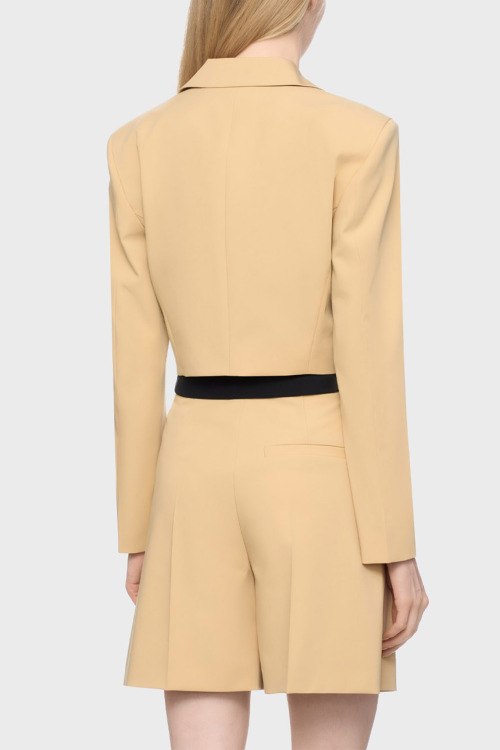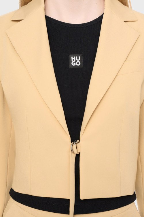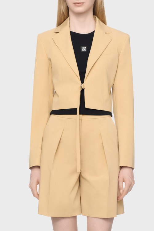 Детали: Женский бежевый костюм Amusina от Hugo by Hugo Boss (Хуго бай Хуго Босс). Жакет: отложной воротник с заостренными лацканами, карман на груди, укороченная длина. Шорты: дизайн со складками, высокая талия, боковые карманы, длина выше колен