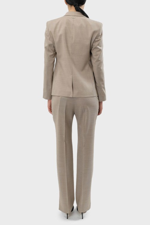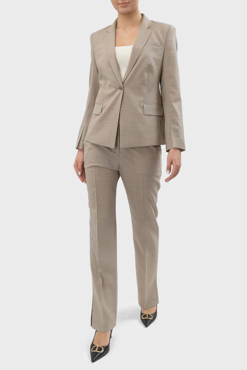 Детали: Женский бежевый костюм Janeri1 из шерсть от Hugo Boss (Хуго Босс). Жакет застегивается на пуговицу, отложной воротник, длинные рукава, карманы с клапаном, брюки классической длины, средняя посадка, застежка на молнию и пуговицу, прямой силуэт