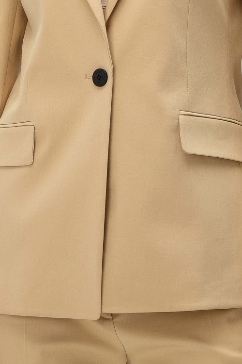 Детали: Женский бежевый костюм Amegan из вискозы и хлопка от Hugo by Hugo Boss (Хуго бай Хуго Босс). Жакет на пуговице, карманы с клапаном, классические брюки прямого кроя, застежка на молнию и пуговицу