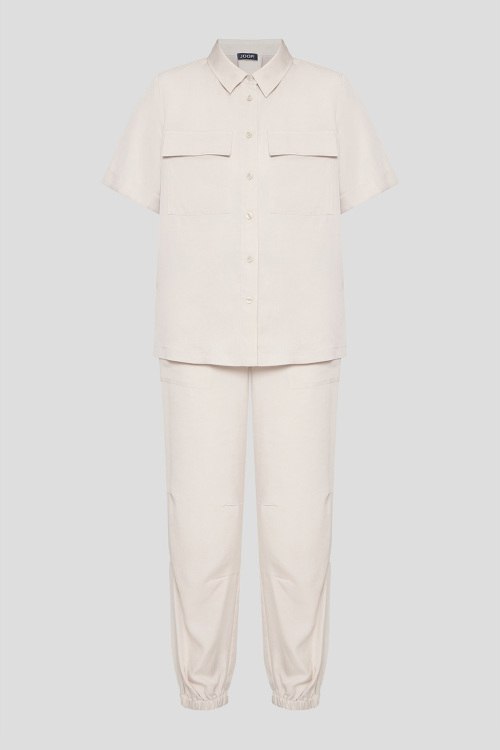 Детали: Женский светло-бежевый костюм из лайкры от Joop! (Йооп!). Рубашка: отложной воротник, два кармана на груди, короткий рукав, застежка на пуговицы, классическая длина. Длина рукава: короткий, для размера 34 - 23 см, обхват груди: для размера 34 - 108 см, обхват талии: для размера 34 - 104 см, длина изделия по среднему шву спинки от горловины: для размера 34 - 60 см. Брюки: эластичный пояс на завязках, боковые карманы, манжеты на резинке, полная длина. Обхват пояса: для размера 34 - 72 см, обхват бедер: для размера 34 - 88 см, длина штанины: для размера 34 - 95,5 см, длина по шаговому шву: для размера 34 - 70 см