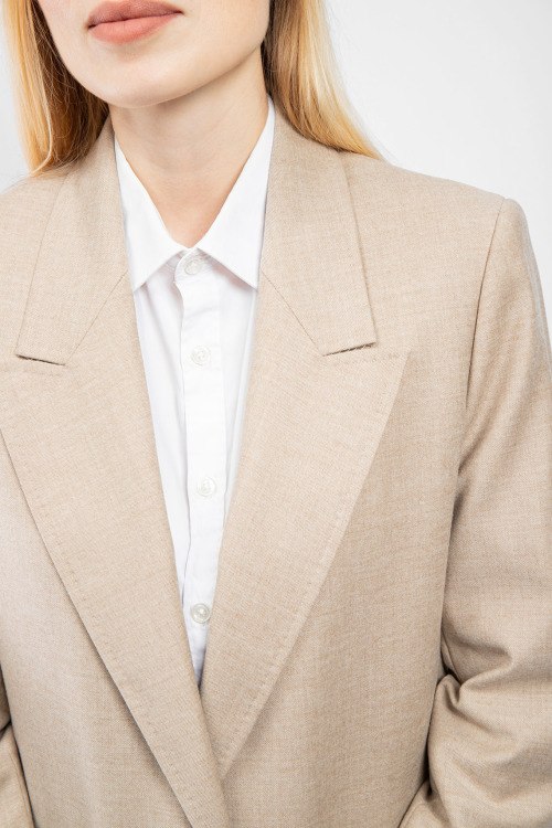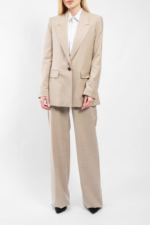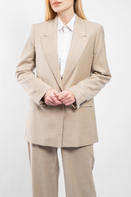 Женский светло-бежевый шерстяной костюм Bolsena от Max Mara Studio (Макс Мара Студио). Жакет: отложной воротник, два кармана, застежка на одну пуговицу, удлиненная длина. Брюки: боковые карманы, пояс с петлями для ремня, полная длина.