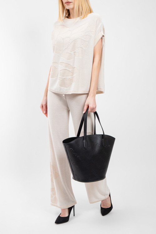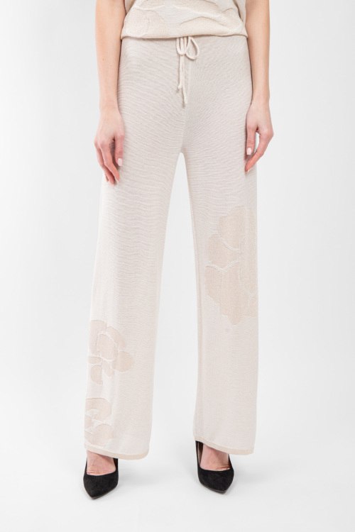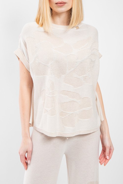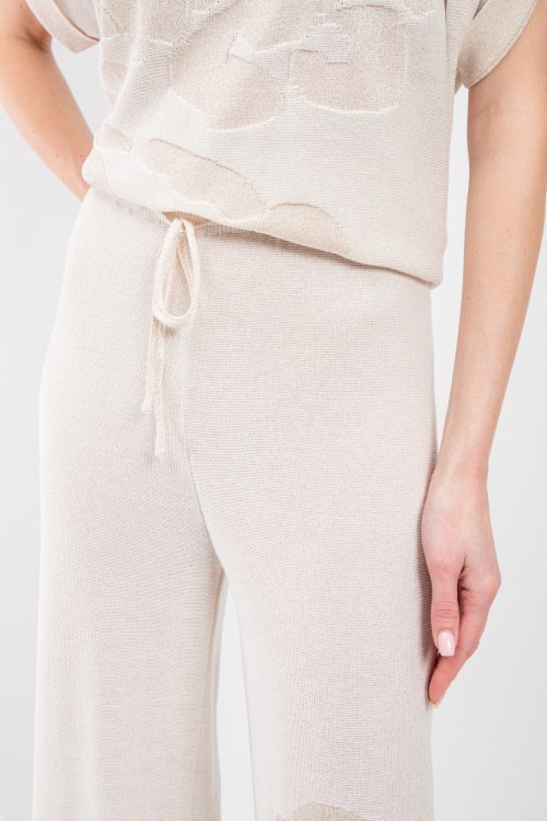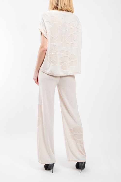 Женский бежевый костюм из вискозного микса от Roberta Biagi (Роберта Бьяджи). Джемпер с коротким рукавом, круглый вырез горловины, брюки классической длины, высокая посадка с кулиской, свободный силуэт, дизайн с узором. Замеры для размера UNI: джемпер: длина: 63 см, ширина по груди: 64 см, ширина по талии 67 см, длина рукава 20 см, ширина рукава 20 см. Брюки: длина: 111 см, ширина штанины вверху 26 см, высота сидения 32 см, ширина по поясу (резинка) 38 см, ширина по бедрам 41 см.