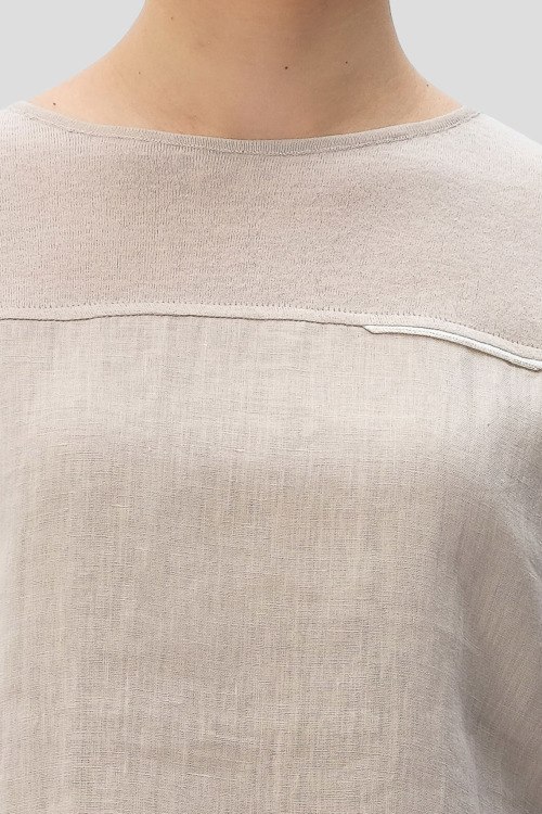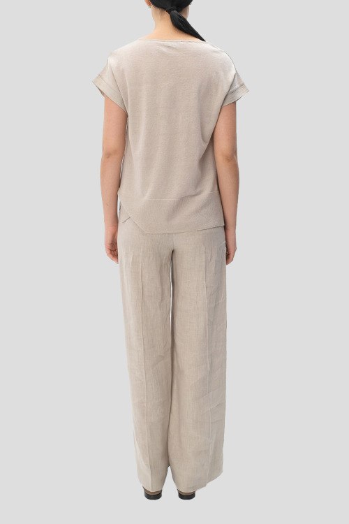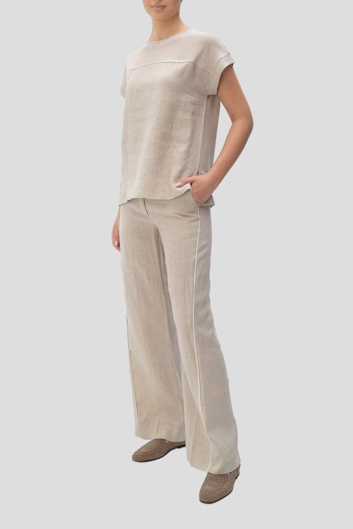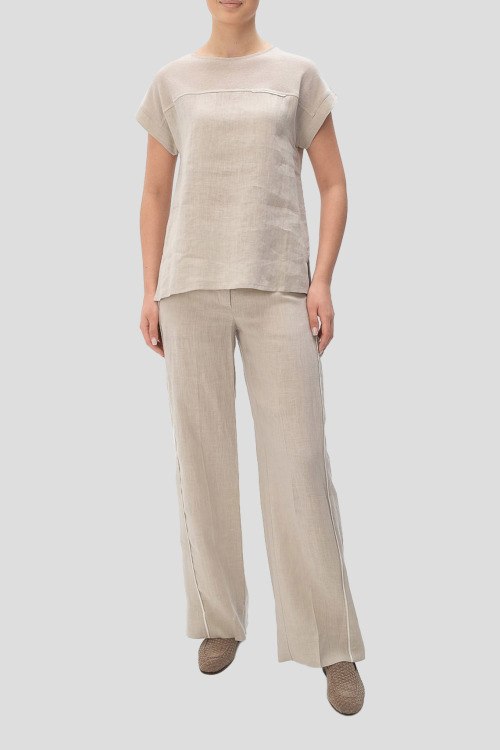 Детали: Женский бежевый костюм из льна от Tonet (Тонет). Блуза с коротким рукавом, круглый вырез горловины, брюки классической длины, прямой крой, высокая посадка, застежка на молнию и пуговицу, прорезные карманы