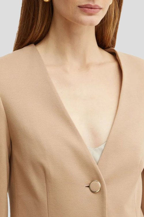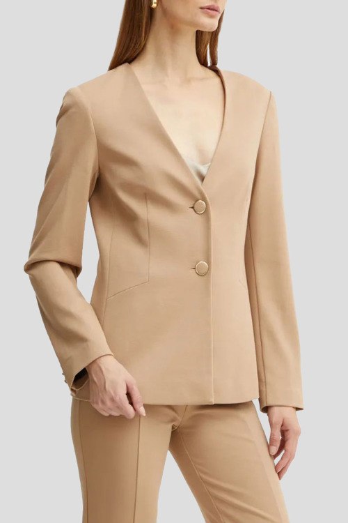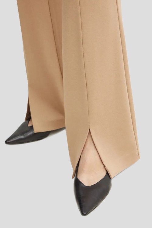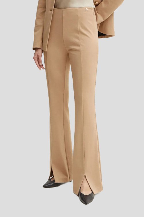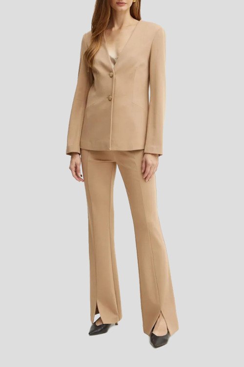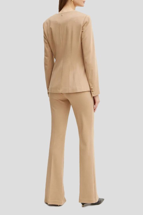 Детали: Женский бежевый трикотажный костюм от TWINSET (Твинсет). Жакет: V-образный вырез, застежка на две пуговицы, классическая длина. Брюки: значок с логотипом А, застежка-молния сбоку, нижний край с разрезом, расклешенный крой, полная длина