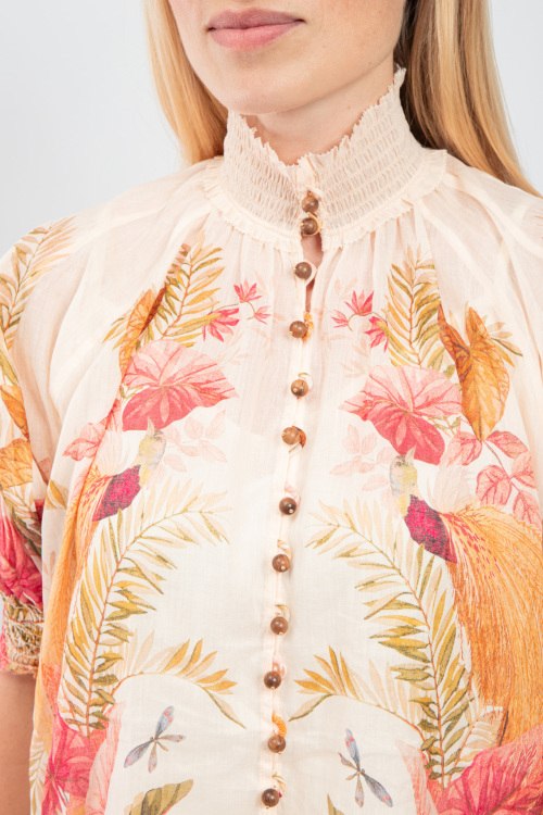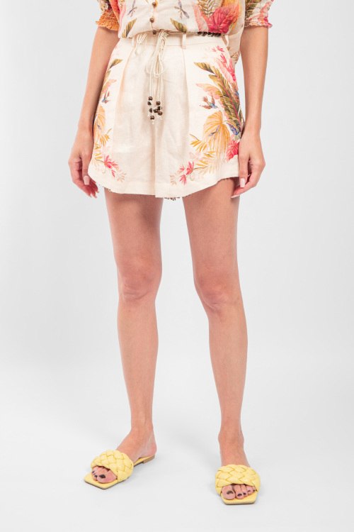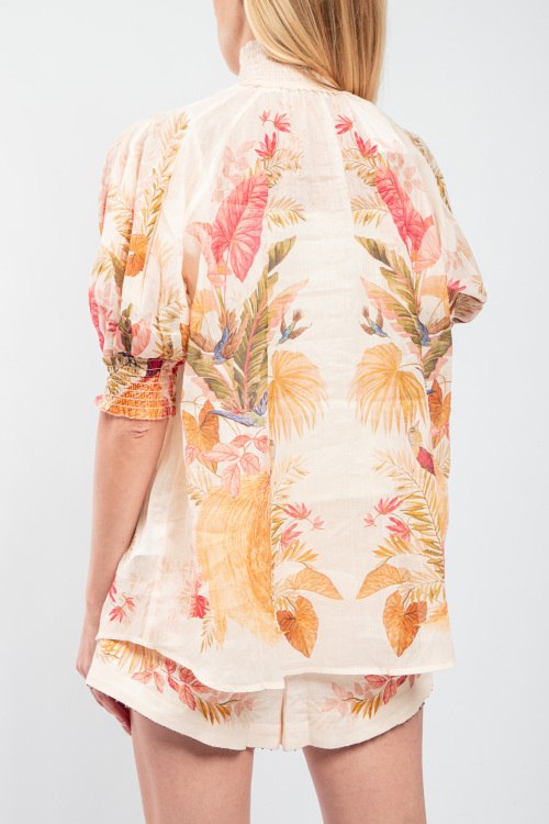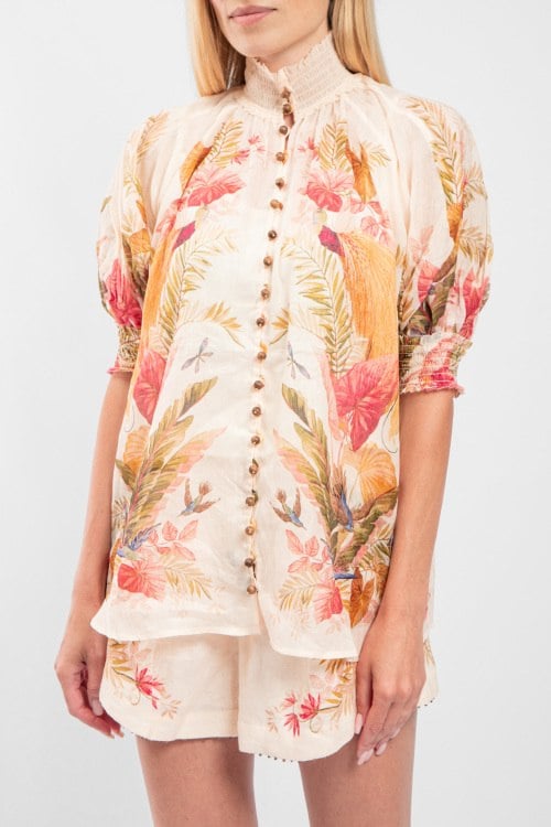 Блуза: цветочный принт, воротник-стойка, короткий рукав-фонарик с эластичным манжетом, застежка на пуговицы, удлиненная длина. Шорты: цветочный принт, пояс с петлями для ремня, короткая длина.