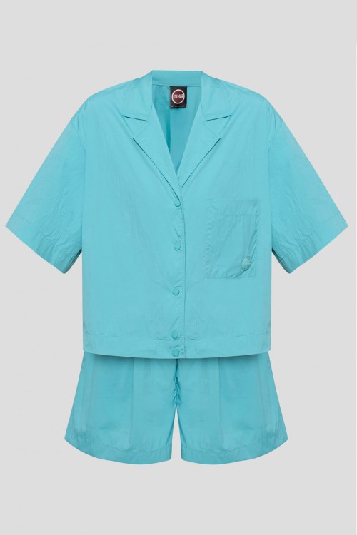 Детали: Женский бирюзовый костюм из нейлона от Colmar (Колмар). Рубашка с коротким рукавом, застежка на кнопки, отложной воротник, нагрудный карман, короткие шорты свободного силуэта, эластичная резинка на поясе с утяжкой, прорезные карманы. Замеры: длина рукава: короткий, для размера S - 23 см, обхват груди: для размера S - 110 см, обхват талии: для размера S - 110 см, длина изделия по среднему шву спинки от горловины: для размера S - 51 см. Шорты: обхват пояса: для размера S - 70 см, обхват бедер: для размера S - 110 см, длина штанины: для размера S - 37 см, длина по шаговому шву: для размера S - 6,5 см