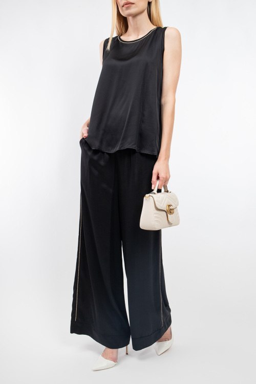 Женский черный костюм из вискозы от Atelier Emi (Ателье Эми). Блуза: модель без рукавов, круглый вырез горловины, классическая длина. Брюки: эластичный пояс, боковые карманы, широкий крой, полная длина. Замеры для размера M: Блуза: длина спереди: 60 см, ширина по груди: 48 см, ширина по талии 51 см, ширина по бедрам 57 см. Брюки: длина: 104 см, ширина штанины вверху 34 см, высота сидения 38 см, ширина по поясу (резинка) 38 см, ширина по бедрам 49 см.