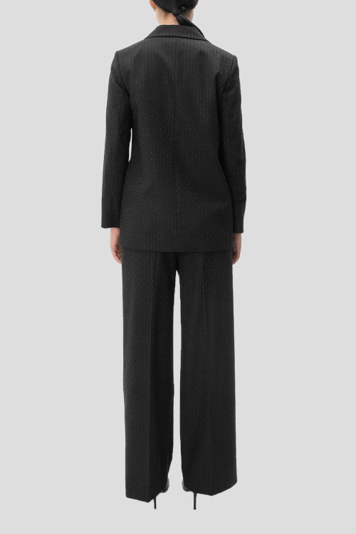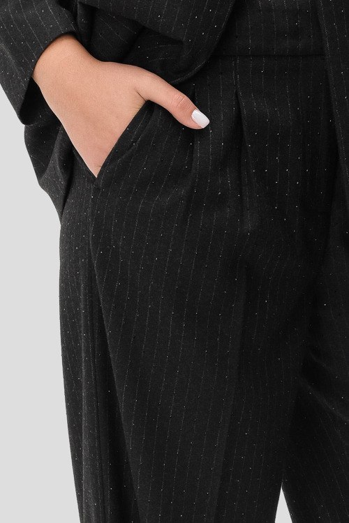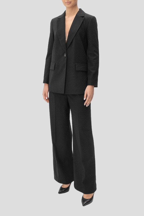 Детали: Женский черный брючный костюм от Cappellini (Каппеллини). Жакет: тонкая полоска, мелкие стразы, отложной воротник, карманы с клапаном, застежка на одну пуговицу. Брюки: дизайн со стрелками, тонкая полоска, мелкие стразы, широкий крой, полная длина