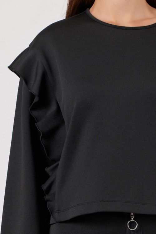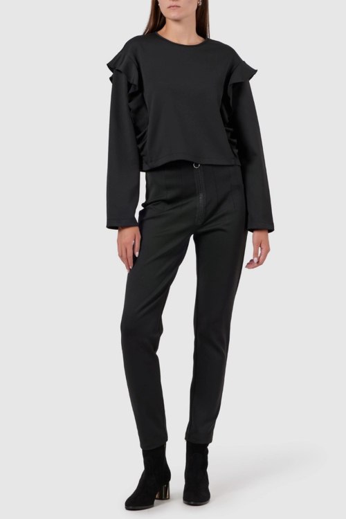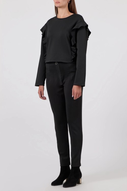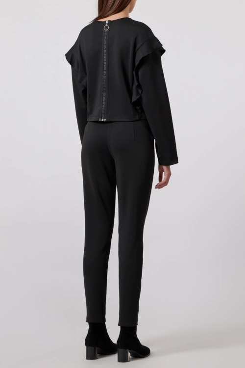 Детали: Женский черный костюм из хлопкового микса от Ice Play (Айс Плей). Джемпер: декор рюшами, круглый вырез горловины, застежка-молния на спине, классическая длина. Брюки: застежка-молния, зауженный крой, укороченная длина