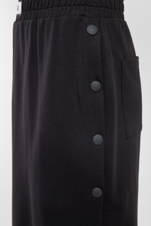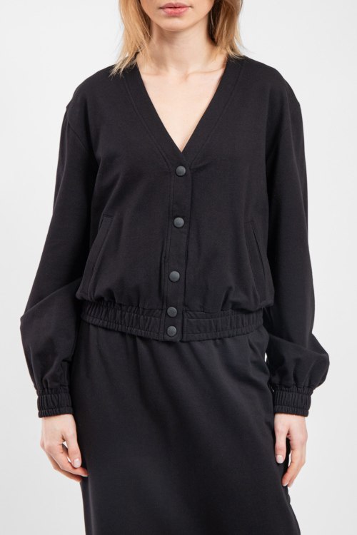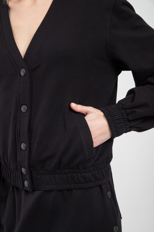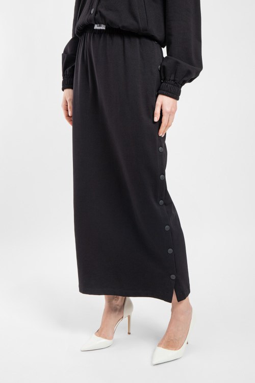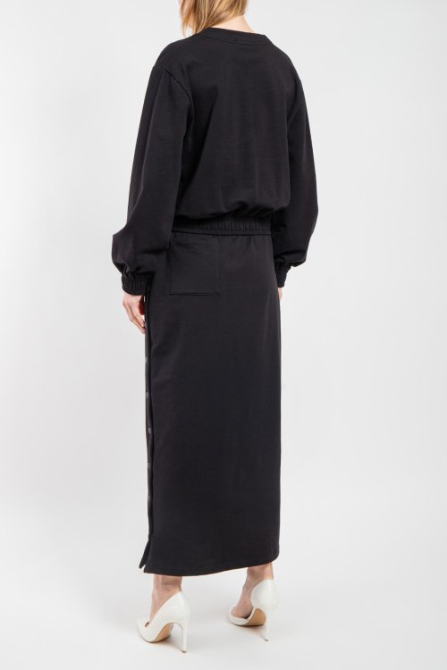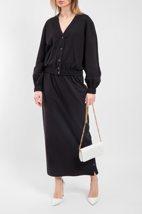 Женский черный костюм из хлопка от J.B4 Just Before (Джаст Бифо). Кардиган на молнии, V-образный вырез горловины, длинные рукава, прорезные карманы, эластичная резинка на манжетах и по низу изделия, юбка длиной макси, высокая посадка, эластичная резинка на поясе, патч-лого, накладной карман сзади, по бокам брендированные кнопки, ровный низ изделия.