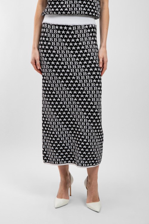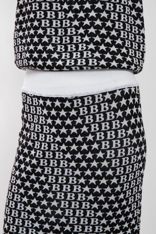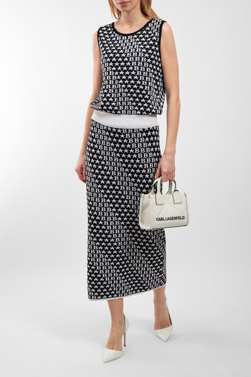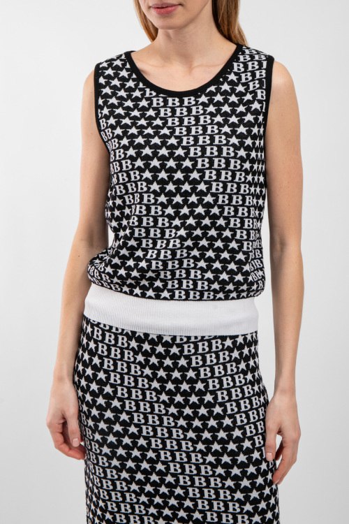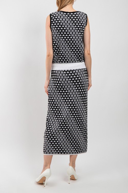 Женский черный трикотажный костюм от Barbara Alvisi (Барбара Алвиси). Джемпер: модель без рукавов, монограмма по всей поверхности, круглый вырез горловины, классическая длина. Юбка: монограмма по всей поверхности, эластичный пояс, длина-миди. Замеры для размера M/L джемпера: Длина: 54 см, ширина по груди: 44 см, ширина по талии: 43 см. Замеры юбки: длина 87 см, ширина по поясу 36 см (резинка), ширина по бёдрам: 45 см.