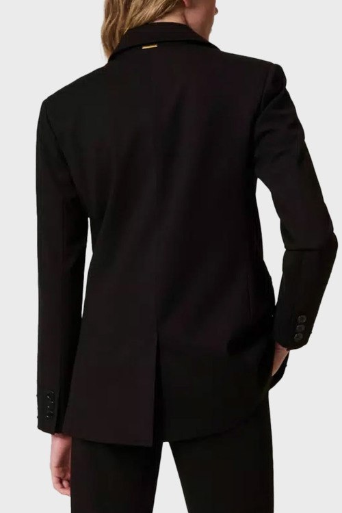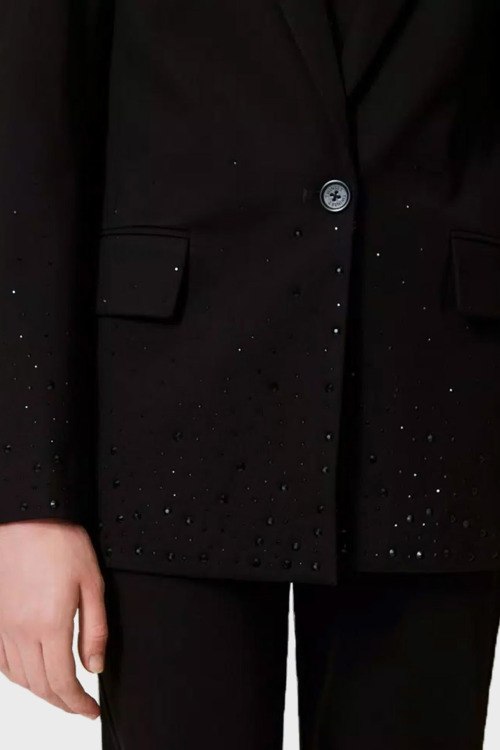 Детали: Женский черный костюм из вискозного микса от TWINSET (Твинсет). Однобортный жакет, отложной воротник, застежка на одну пуговицу, накладные карманы с клапаном, брюки с высокой посадкой, облегающего силуэта, прорезные карманы