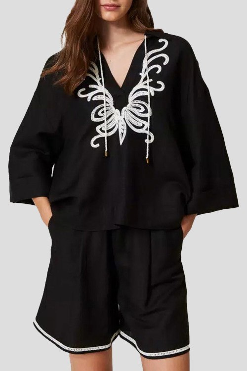 Детали: Женский черный костюм из льна и вискозы от TWINSET (Твинсет). Блуза: V-образный вырез, белая вышивка на груди, укороченный широкий рукав. Шорты: боковые карманы, нижний край с вышивкой, короткая длина