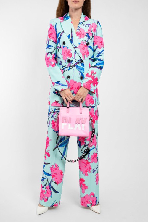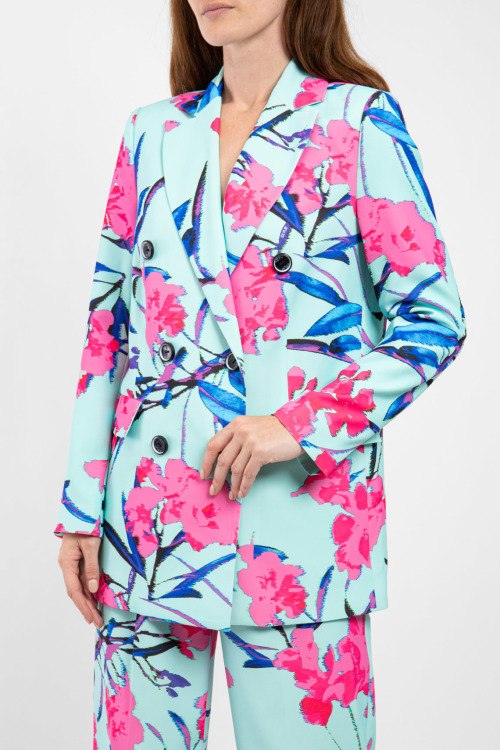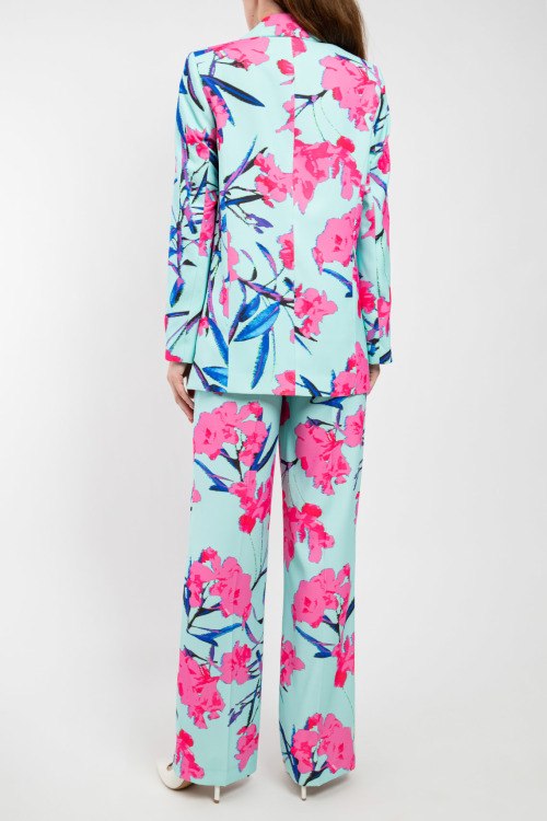 Женский голубой костюм из полиэстера от Ice Play (Айс Плей). Дизайн с цветочным принтом по всей поверхности изделия, удлиненный жакет, отложной воротник, застежка на пуговицы, двубортная модель, карманы с клапаном, брюки-палаццо классической длины, высокая посадка, застежка на молнию и пуговицу, петли в поясе для ремня, прорезные карманы.
