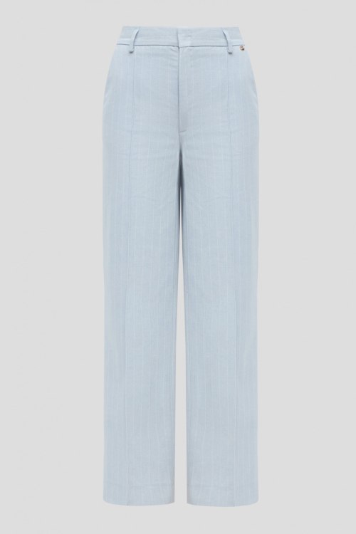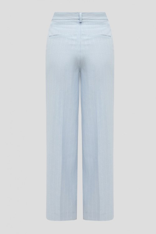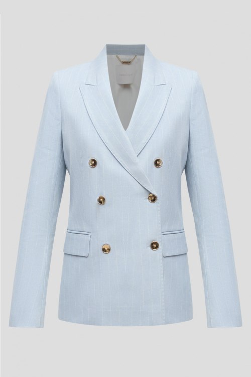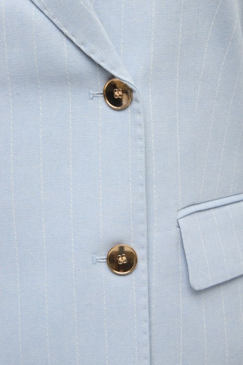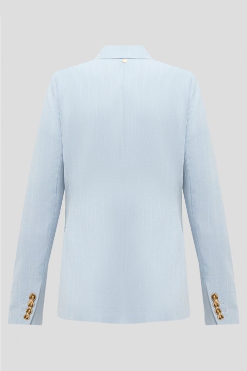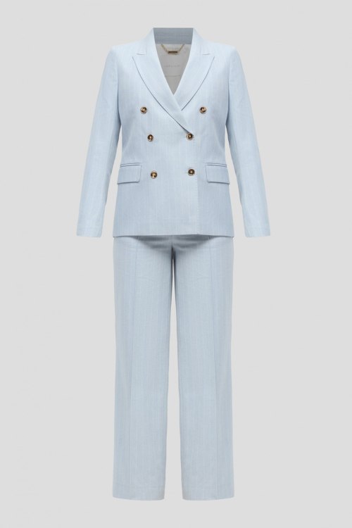 Детали: Женский голубой костюм из хлопка от Rich & Royal (Рич энд Роял). Жакет с отложным воротником, двубортная застежка на пуговицы, карманы с клапаном, дизайн в полоску, брюки с высокой посадкой, застежка на молнию, прорезные карманы, петли в поясе для ремня. Замеры: жакет: длина рукава: длинный, для размера 34 - 60 см Обхват груди: для размера 34 - 90 см, обхват талии: для размера 34 - 84 см, длина изделия по среднему шву спинки от горловины: для размера 34 - 66 см. Брюки: обхват пояса: для размера 34 - 66 см, обхват бедер: для размера 34 - 94 см, длина штанины: для размера 34 - 106 см, длина по шаговому шву: для размера 34 - 77 см