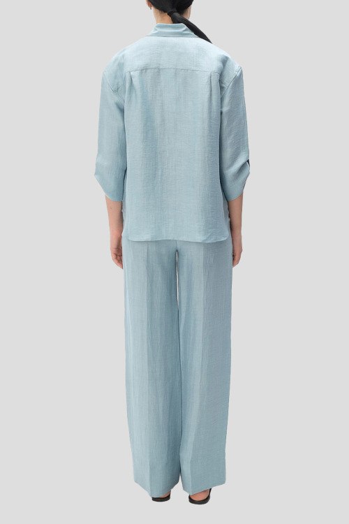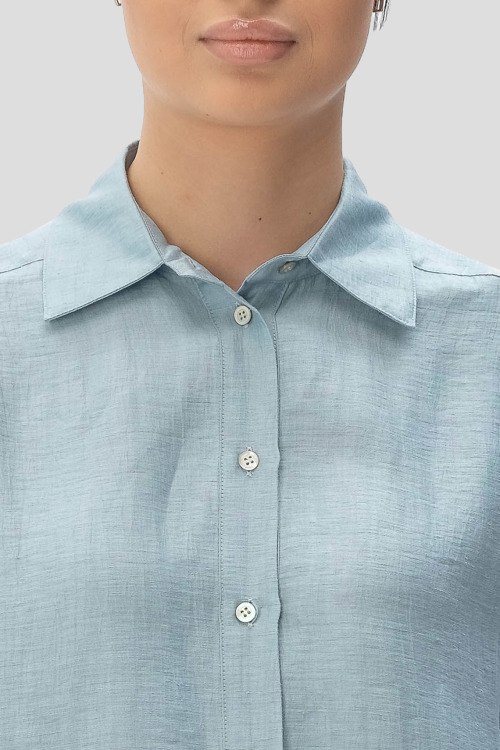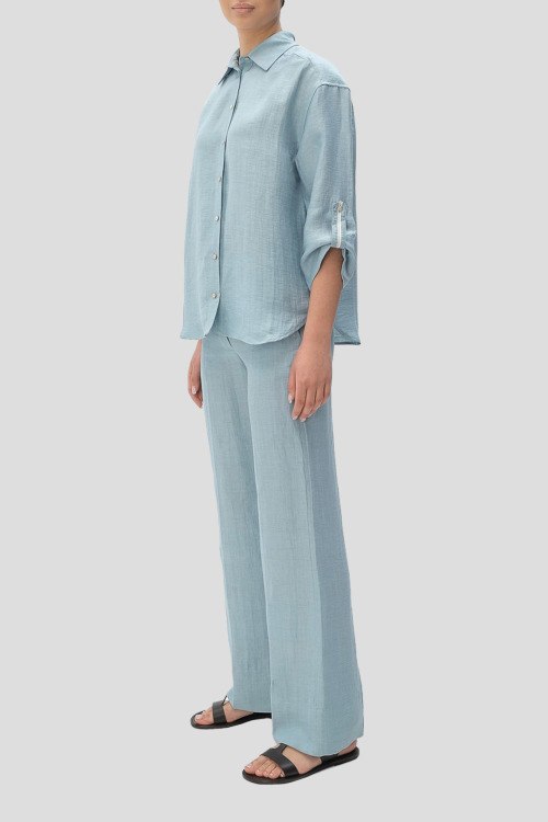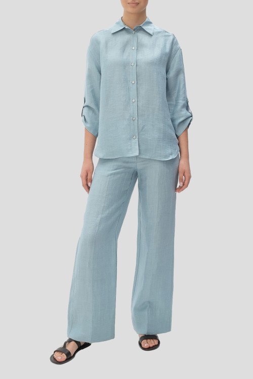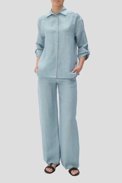 Детали: Женский голубой костюм из льна и нейлона от Tonet (Тонет). Рубашка на пуговицах, укороченные рукава, классический воротник, фигурный низ изделия, брюки прямого кроя, классическая длина, прорезные карманы