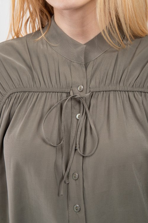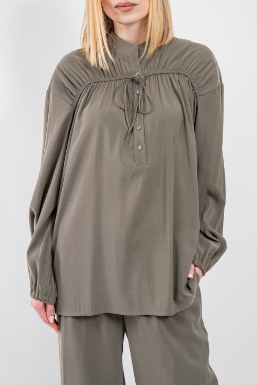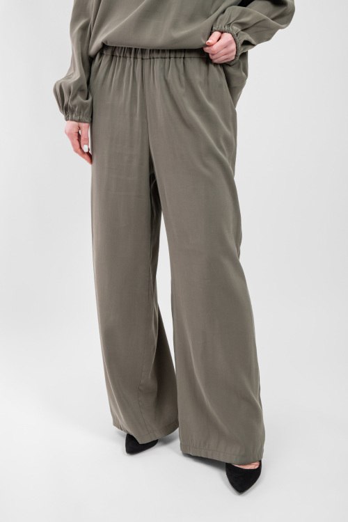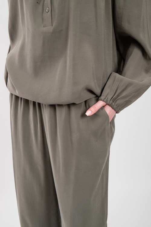 Женский вискозный костюм цвета хаки от Clothe (Клозе). Блуза на пуговицах с кулиской, длинные рукава, длинные рукава, эластичная резинка на манжетах, брюки классической длины, свободный силуэт. Замеры для размера L: блуза: длина: 74 см, ширина по груди 66 см, ширина по талии 66 см, ширина по бедрам 66 см, длина рукава 41 см, ширина рукава 20 см, Брюки: длина: 109 см, ширина штанины вверху 35 см, высота сидения 38 см, ширина по поясу (резинка) 38 см, ширина по бедрам 50 см.