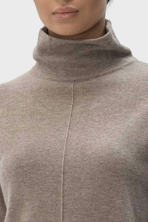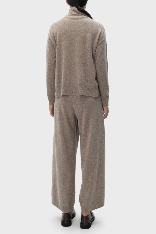 Детали: Женский светло-коричневый костюм из шерсти и кашемира Scrivia от Max Mara Weekend (Макс Мара Викенд). Джемпер: высокая горловина, спущенная линия плеча, классическая длина, манжеты и нижний край в рубчик. Брюки: эластичный пояс на завязках, широкий крой, полная длина