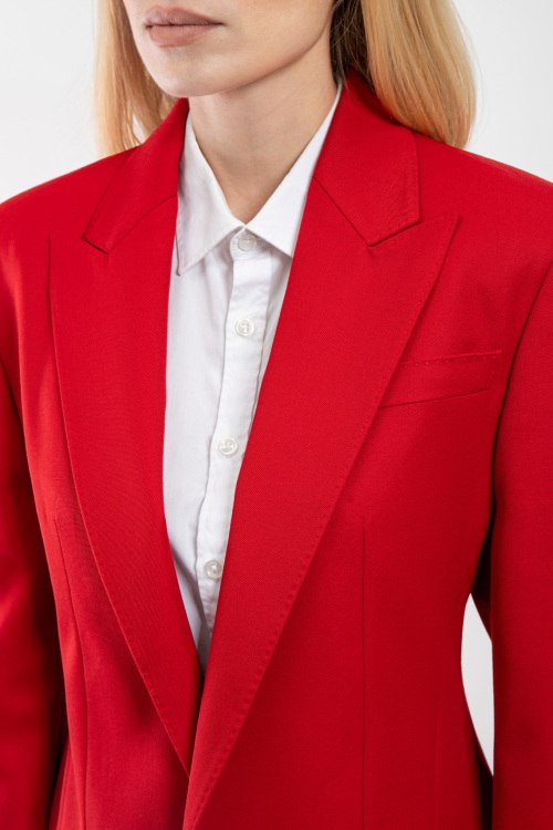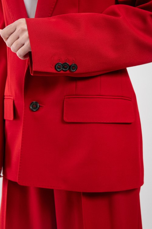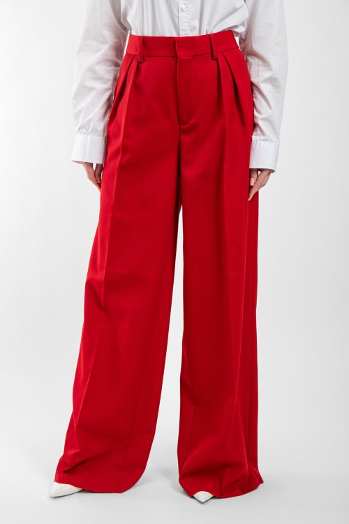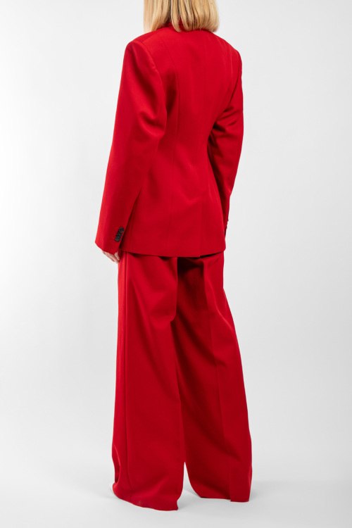 Женский красный костюм из шерстяного микса от Dsquared2 (Дискваред). Однобортный жакет, застежка на пуговицу, карманы с клапаном, брюки-палаццо классической длины, высокая посадка, застежка на молнию и пуговицу, петли в поясе для ремня.