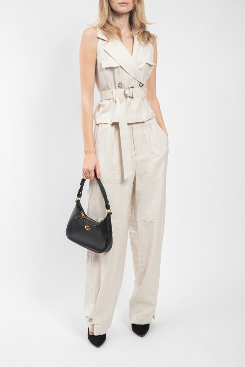 Женский костюм из вискозы молочного оттенка от Liu Jo (Лиу Джо). Жилет: модель на запах, двубортный фасон, застежка на пуговицы, в талии пояс с металлической пряжкой, классическая длина. Брюки: эластичный пояс, боковые и задние карманы, полная длина.