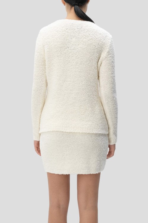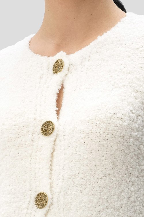Детали: Женский кремовый шерстяной костюм от TWINSET (Твинсет). Кардиган: круглый вырез горловины, два кармана, застежка на три золотистые пуговицы. Юбка: эластичный пояс, облегающий фасон, короткая длина
