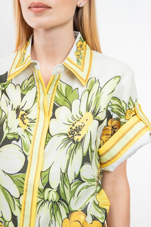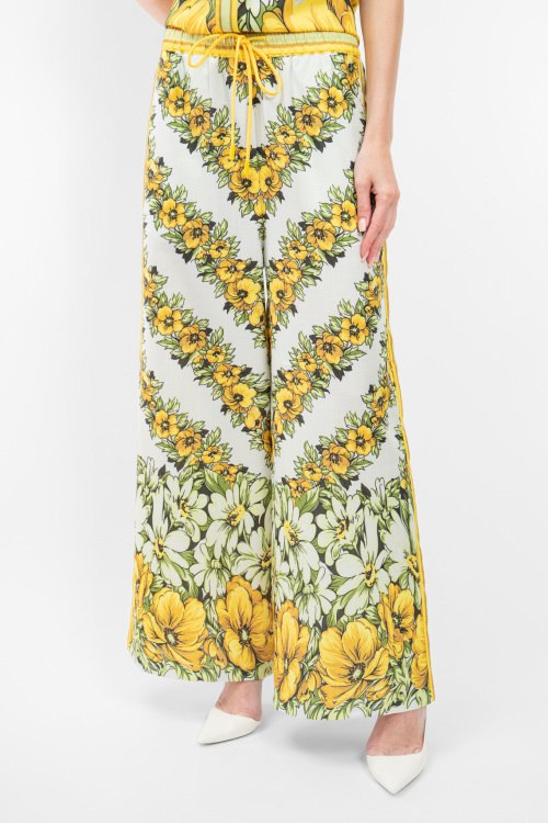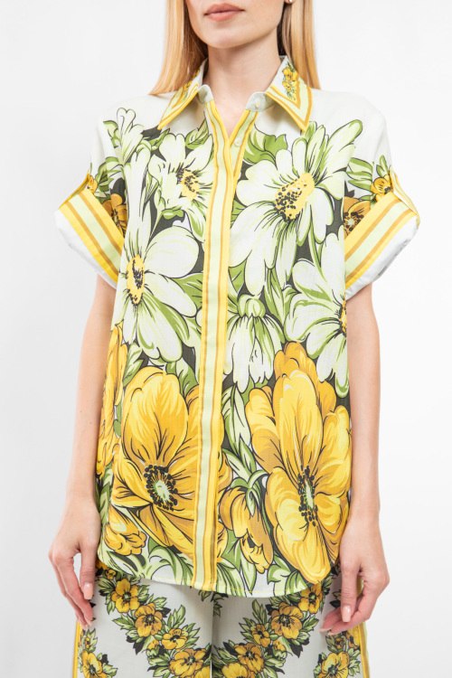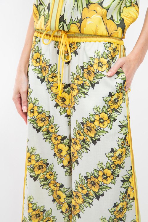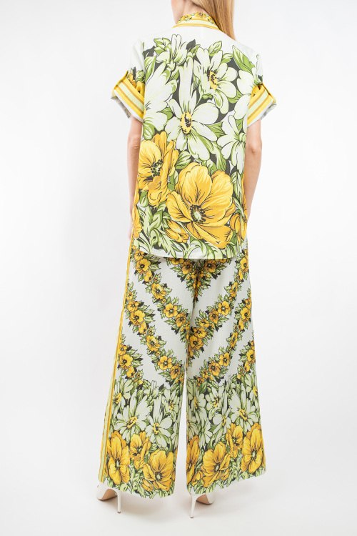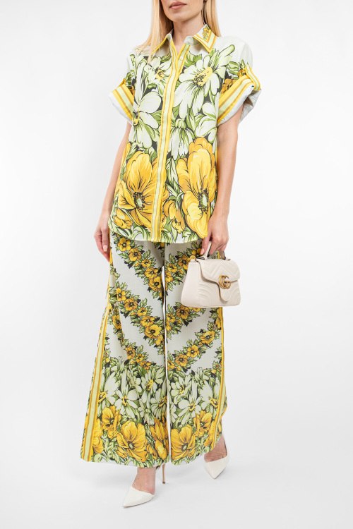 Детали: Женский хлопковый брючный костюм от Buby S (Баби Эс). Рубашка: цветочный принт по всей поверхности, отложной воротник, короткий рукав, скрытая застежка на пуговицы, классическая длина. Замеры: длина: 73 см, ширина по груди: 55 см, ширина по талии 57 см, ширина по бедрам 57 см, длина рукава: 14 см, ширина рукава 24 см. Брюки: цветочный принт по всей поверхности, эластичный пояс на завязках, боковые карманы, широкий крой, полная длина. Замеры: длина: 105 см, ширина штанины вверху 35 см, высота сидения 42 см, ширина по поясу (резинка) 36 см, ширина по бедрам 49 см