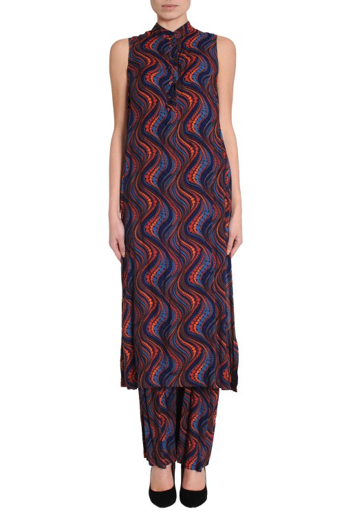 Детали: Летний костюм в цветной принт. Низ - брюки прямого кроя, верх - длинная блуза в пол не пуговицах и без рукавов