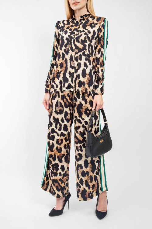 Женский леопардовый брючный костюм от J.B4 Just Before (Джаст Бифо). Блуза: лампасы вдоль рукавов, отложной воротник, застежка на пуговицы, манжеты на пуговицах, классическая длина. Брюки: эластичный пояс, лампасы по бокам, широкий крой, полная длина.