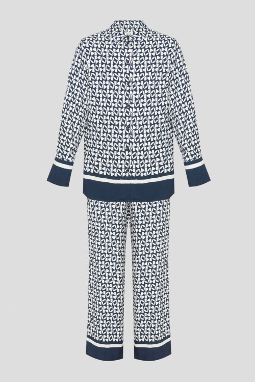 Женский брючный костюм из вискозы и полиэстера от Maerz (Маерз). Дизайн с узором по всей поверхности изделия, блуза на пуговицах, длинные рукава. Замеры: обхват груди: для размера 36 - 100 см, обхват талии: для размера 36 - 92 см, длина изделия по среднему шву спинки от горловины: для размера 36 - 56 см. Брюки прямого кроя, эластичный пояс, обхват пояса для размера 36 - 70 см, обхват бедер: для размера 36 - 116 см