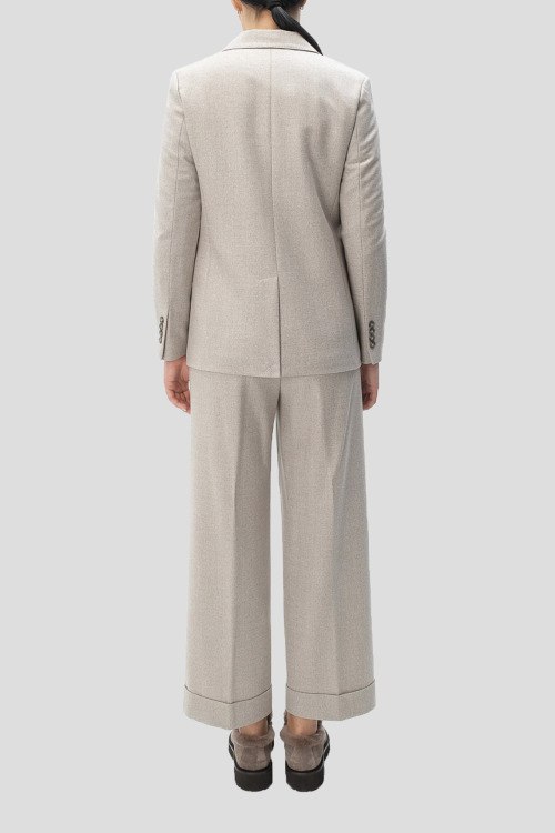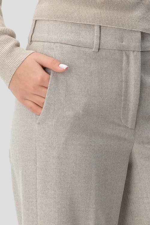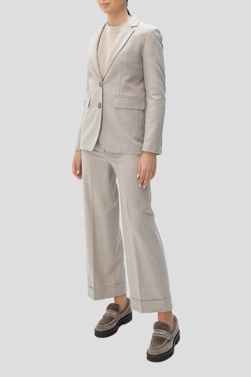 Детали: Женский светло-серый шерстяной костюм от Cappellini (Каппеллини). Жакет: отложной воротник, два кармана с клапанами, застежка на две пуговицы, классическая длина. Брюки: боковые карманы, пояс с петлями для ремня, широкий крой, укороченная длина