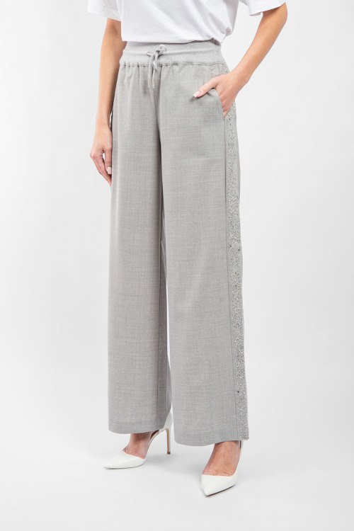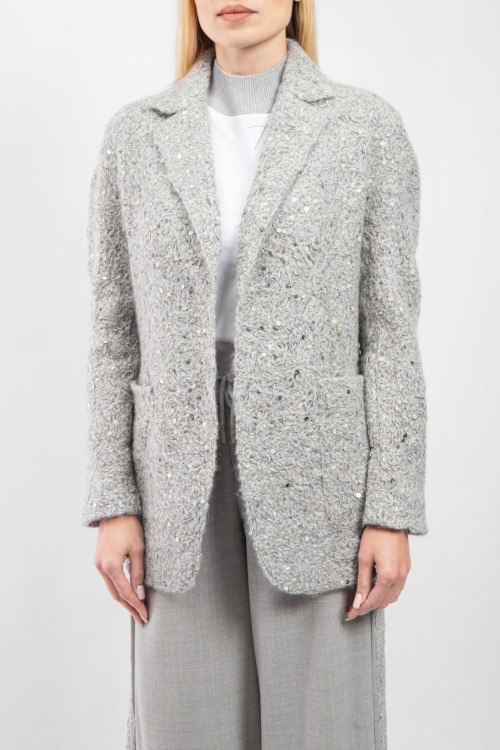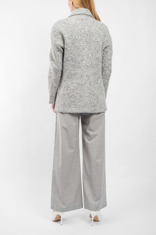 Женский серый костюм из альпаки и мохера от Panicale Cashmere (Паникале Кашемир). Жакет: декор пайетками по всей поверхности, отложной воротник, передние накладные карманы, без застежки, удлиненная длина. Брюки: эластичный пояс на завязках, лампасы с пайетками, боковые карманы, широкий крой, полная длина.