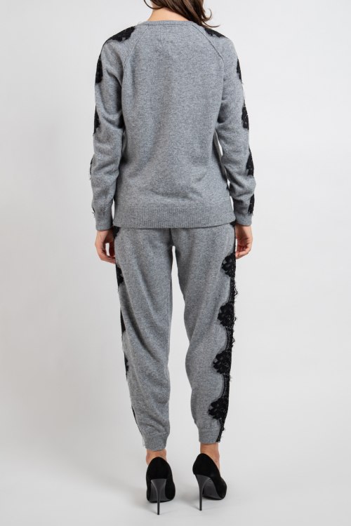 Детали: Женский серый костюм из шерстяного микса от Pink Memories (Пинк Меморис). Джемпер с круглым вырезом горловины, вдоль рукавов черные кружевные лампасы, манжеты и нижний край в рубчик. Брюки с передними накладными карманами, черные кружевные лампасы по бокам, внизу на манжетах