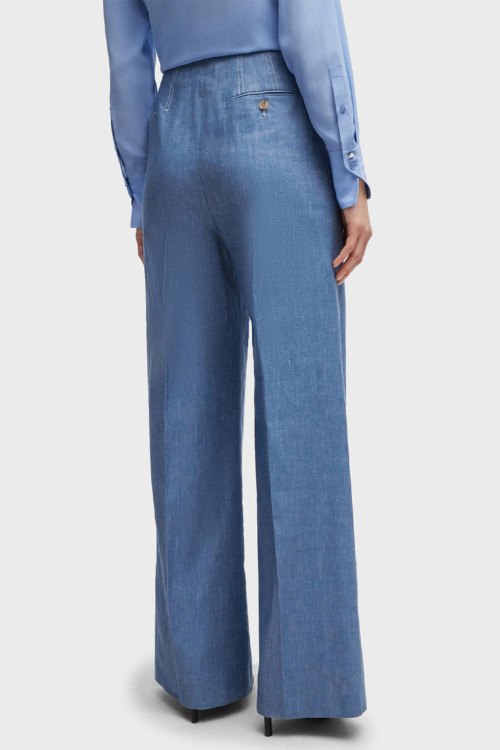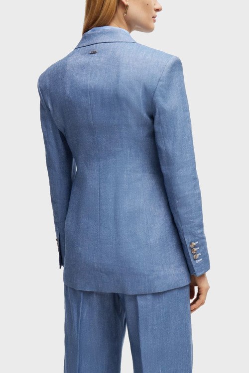 Детали: Женский синий брючный костюм из льна и хлопка Jerela от Hugo Boss (Хуго Босс). Жакет: отложной воротник, три передних кармана, застежка на две пуговицы, удлиненная длина. Брюки: завышенная талия, боковые карманы, дизайн со стрелками, широкий крой, полная длина
