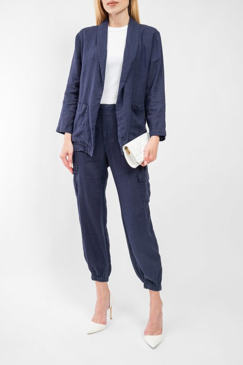Женский темно-синий льняной костюм от Deha (Деха). Жакет: модель без застежки, отложной воротник, накладные карманы, классическая длина. Брюки: боковые карманы, накладные карманы-карго, манжеты на резинке, укороченная длина.