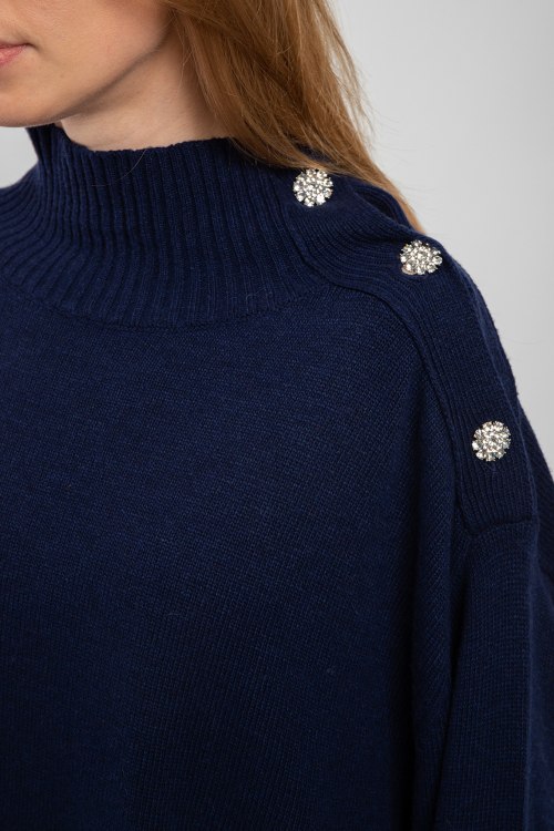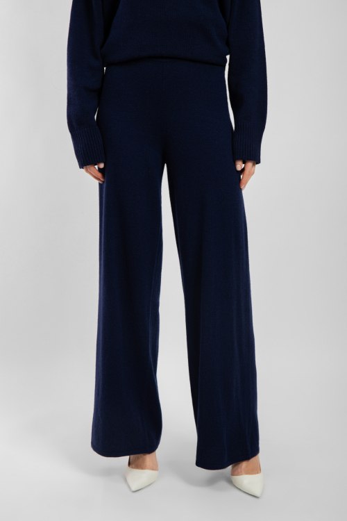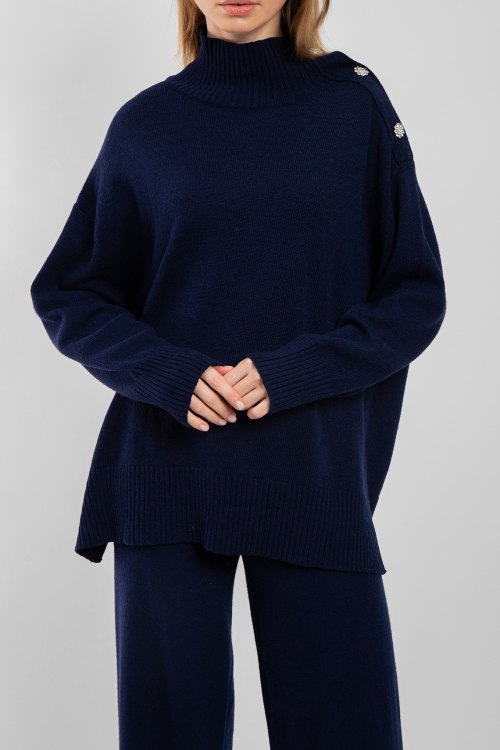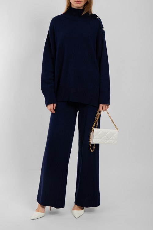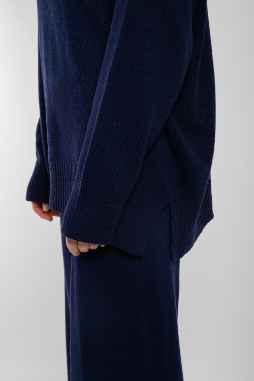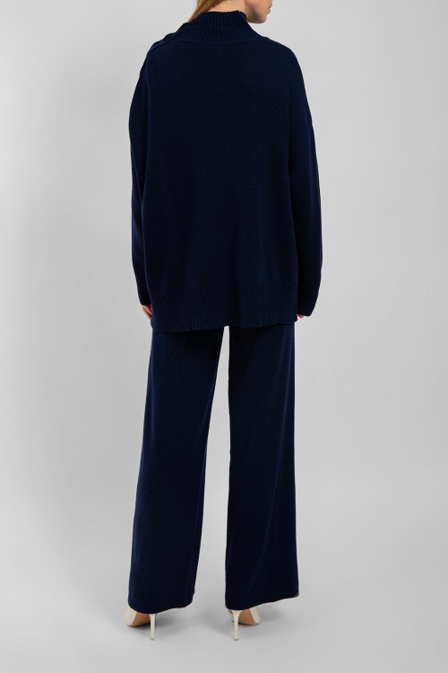 Женский темно-синий костюм из шерстяного микса от Kontatto (Контатто).Трикотажный костюм с широкими брюками. Джемпер: плечевая боковая застежка, широкая резинка с разрезами по бокам, воротник-стойка, брюки с высокой посадкой, эластичная резинка на поясе. Замеры джемпера: длина: 66 см, ширина по груди: 66 см, внизу: 65, ширина по талии : 66 см, длина рукава: 35 см, ширина: 19 см, . Брюки: длина 113 см, ширина по поясу 33,5 см (резинка), ширина по бедрам: 39,5 см, высота сидения: 35 см, ширина штанины сверху: 27,5 см, ширина штанины внизу : 30 см.