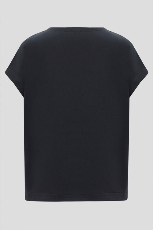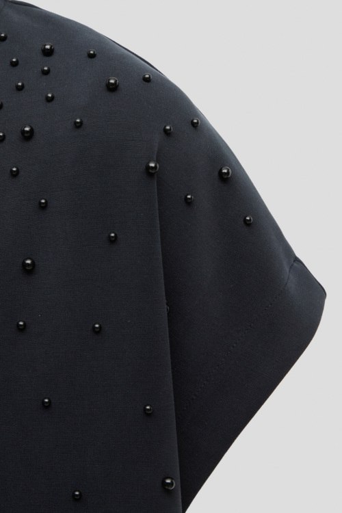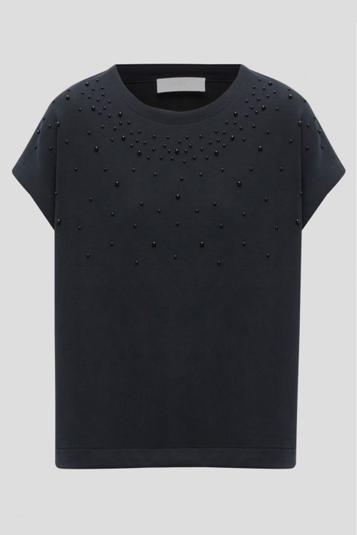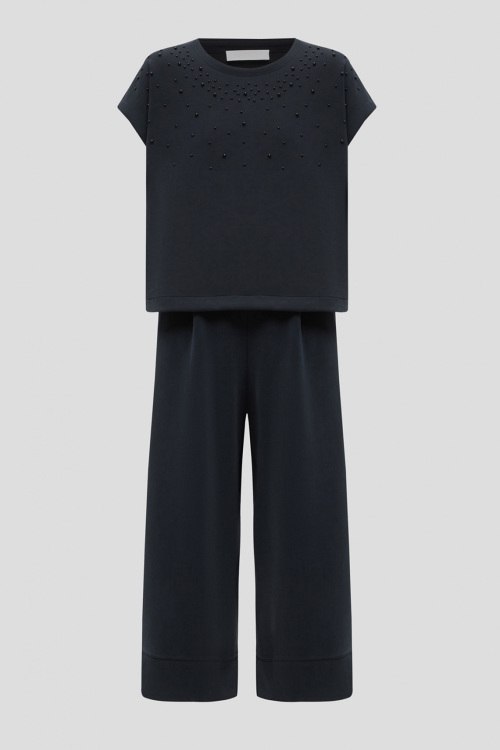 Детали: Женский темно-синий костюм из модала и полиэстера от Rich & Royal (Рич энд Роял). Футболка декорирована искусственным жемчугом, короткие рукава, круглый вырез горловины. Длина рукава: короткий, для размера S - 21 см, обхват груди: для размера S - 110 см, обхват талии: для размера S - 106 см, длина изделия по среднему шву спинки от горловины: для размера S - 55 см. Брюки с эластичным поясом, четыре кармана, прямой силуэт. Обхват пояса: для размера S - 64 см, обхват бедер: для размера S - 108 см, длина штанины: для размера S - 93 см, длина по шаговому шву: для размера S - 61 см