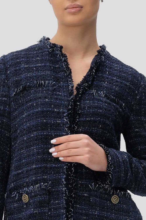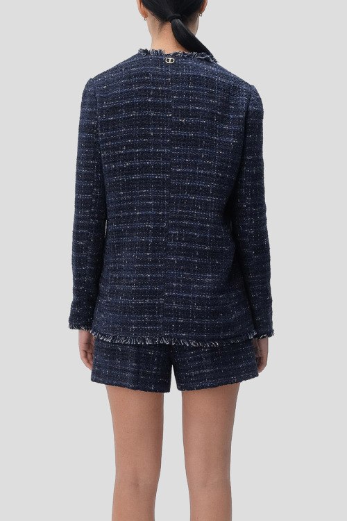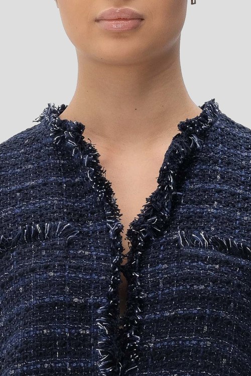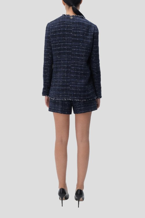 Детали: Женский темно-синий твидовый костюм от TWINSET (Твинсет). Жакет: модель без воротника, отделка бахрамой, четыре передних кармана, застежка на крючки. Шорты: застежка-молния сбоку, короткая длина