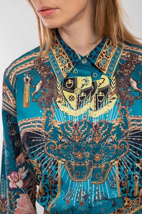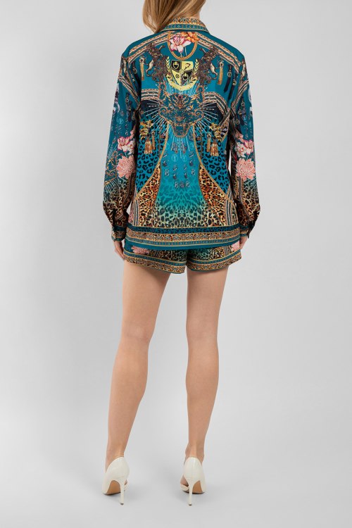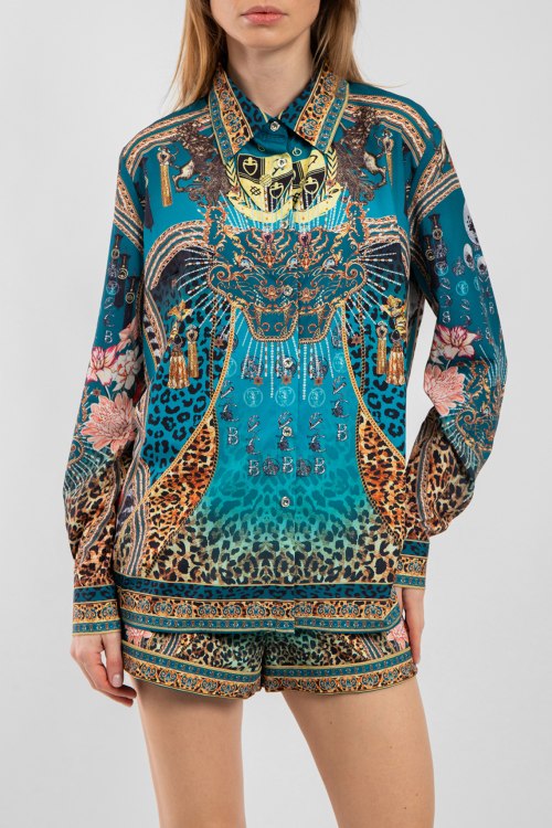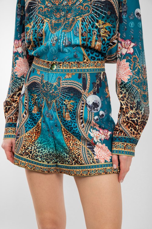Женский зеленый костюм из хлопка и полиэстера от Buby S (Баби Эс). Дизайн с принтом по всей поверхности изделия, рубашка на пуговицах, с длинным рукавом, отложной воротник, короткие шорты, высокая посадка, застежка на молнию и пуговицу спереди. Замеры для размера L: замеры рубашки: длина: 68,5 см, ширина по груди: 53 см (есть вытачки), ширина по талии : 53 см, ширина бедер: 56 см, длина рукава: 47,5 см, ширина: 17,5 см, . Шорты: вшитая подкладка. замеры шорт: длина 37,5 см, ширина по поясу 39 см (не тянется), ширина по бедрам: 46,5 см, высота сидения: 36 см, ширина штанины : 33,5 см.