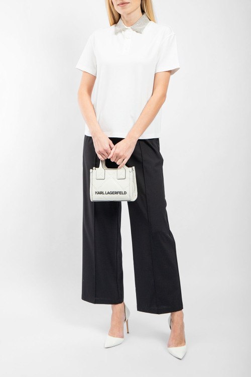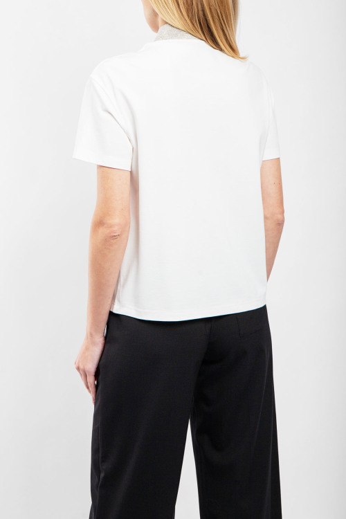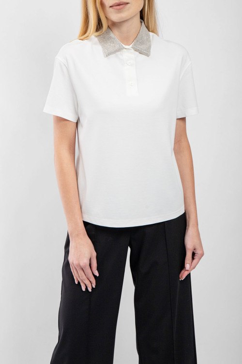 Детали: Женская белая хлопковая футболка-поло Monili от Brunello Cucinelli (Брунелло Кучинелли). Отложной воротник с кристаллами, застежка на три пуговицы, короткий рукав, классическая длина