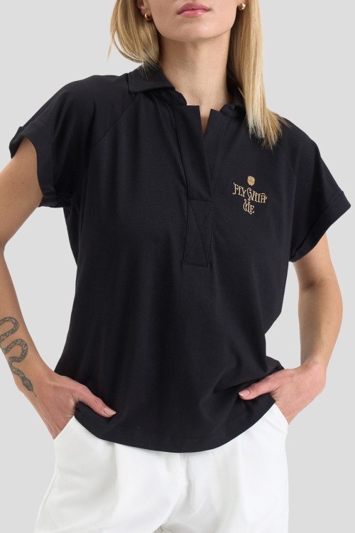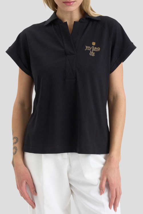 Детали: Женская черная хлопковая футболка-поло от Aeronautica Militare (Аэронавтика Милитари). Вышивка на груди, отложной воротник, V-образный вырез, короткий рукав, классическая длина