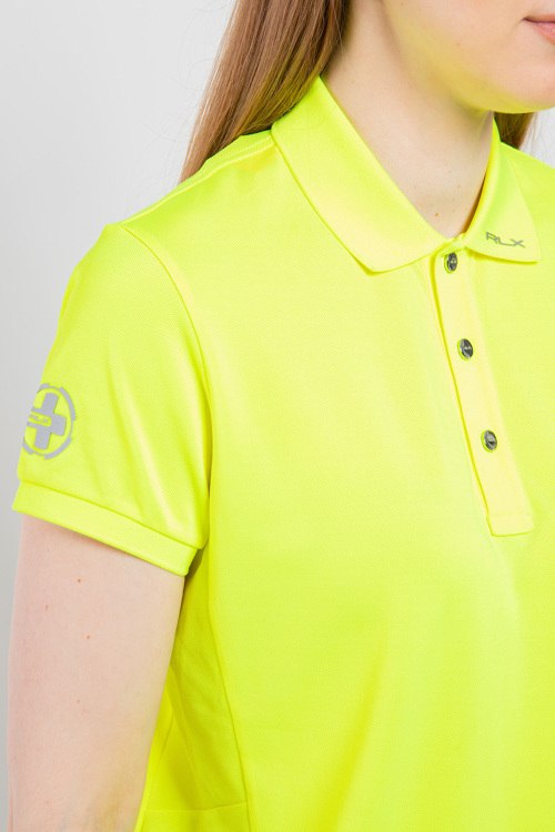 Детали: Женская неоново-желтая футболка-поло от Ralph Lauren (Ральф Лорен). RLX Ralph Lauren – спортивная линия для фитнеса и активного образа жизни. Отложной воротник, застежка на кнопки, короткий рукав, принт с логотипом на рукаве, на воротнике и на кокетке, классическая длина